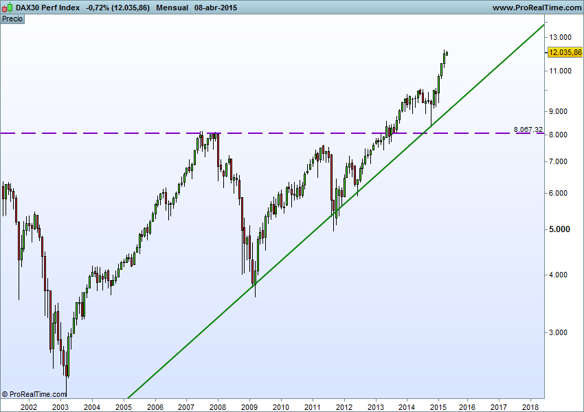 Este cuadro mola para invertir en activos de riesgo. Y mola mucho. A continuación vamos a ver el gráfico del DAX que es un índice total return y es el que marca la pauta. Alcista sin discusión. Es más; puede corregir hasta un 20% y seguiría siendo alcista, así que piensen como van a ajustar sus stops cuando venga una corrección (que vendrá, por Varoufakis o por los islamistas o por un nuevo conato en Luis Enrique y Messi…pero vendrá). Puede ampliar los gráficos clickando.
