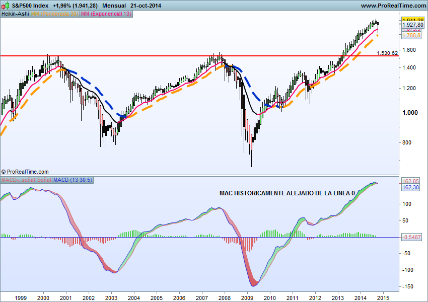 AD line del NYSE, (valores que suben menos valores que bajan). Desde máximos de agosto cayendo y, como ya hizo en febrero con rotura de la media móvil de 50 periodos y Ojo, a diferencia de febrero, media con pendiente negativa .