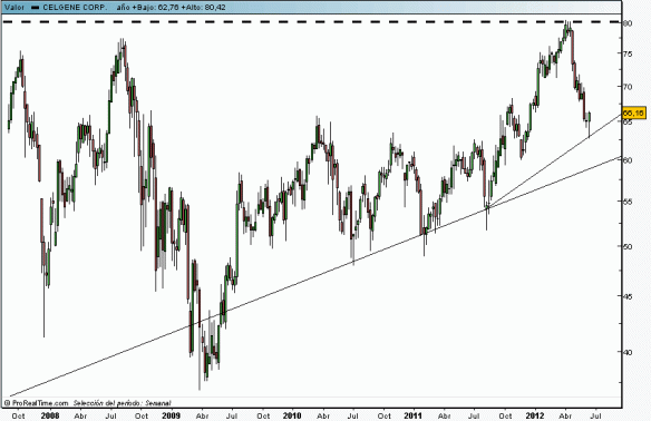 Luego rock duro con biotech americana: Celgene. Compramos a 65 y hoy está a 79. Con mucha volatilidad eso si. Esto es un 21% en seis meses. Con altibajos y momentos de fuerte dolor de estómago, pero nadie dijo que ganar un 21% semestral fuese fácil.