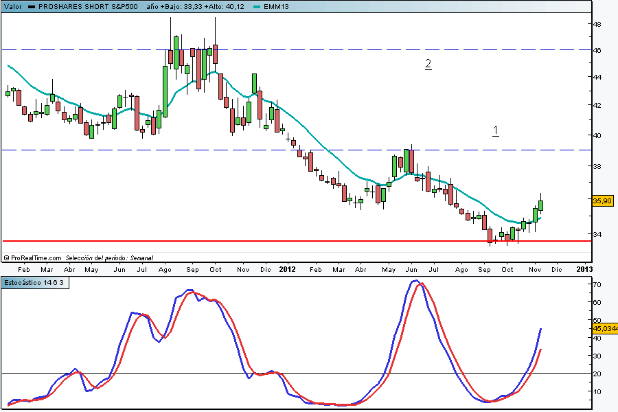 – En el caso de S&P las opciones son amplías. Solo nombraré dos de los más líquidos como son el SH/Short SP 500 Proshares y el SDS tambien de Proshares pero ultrashort (x2) (apalancado)