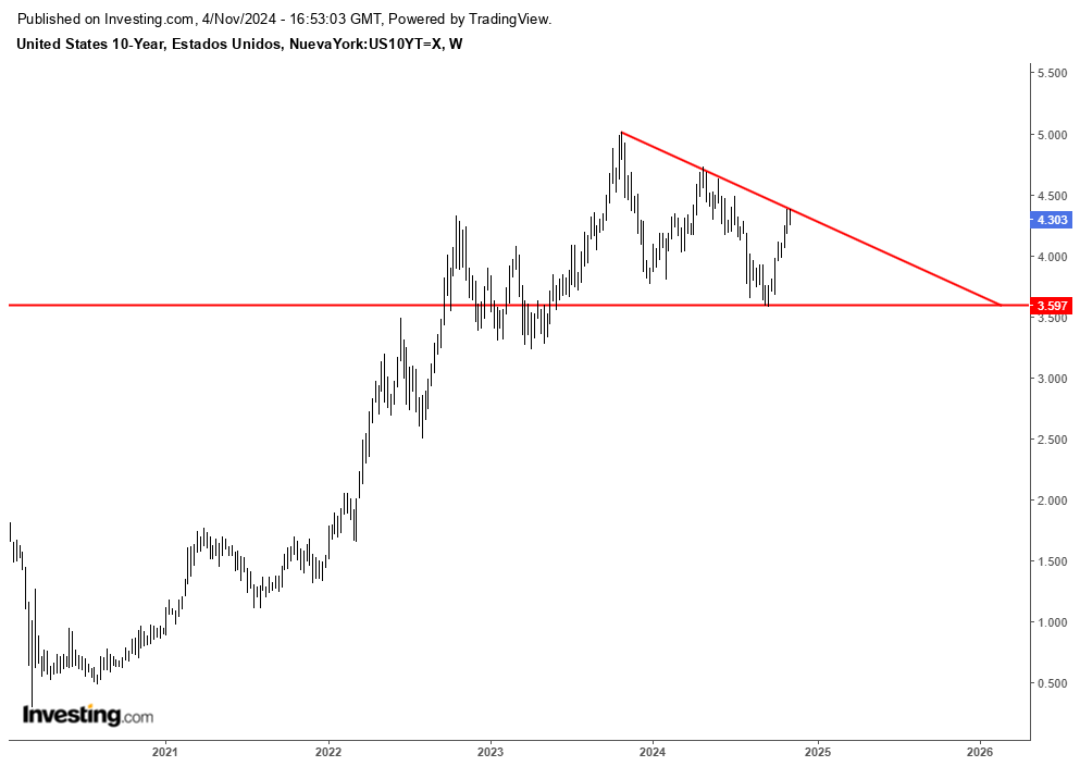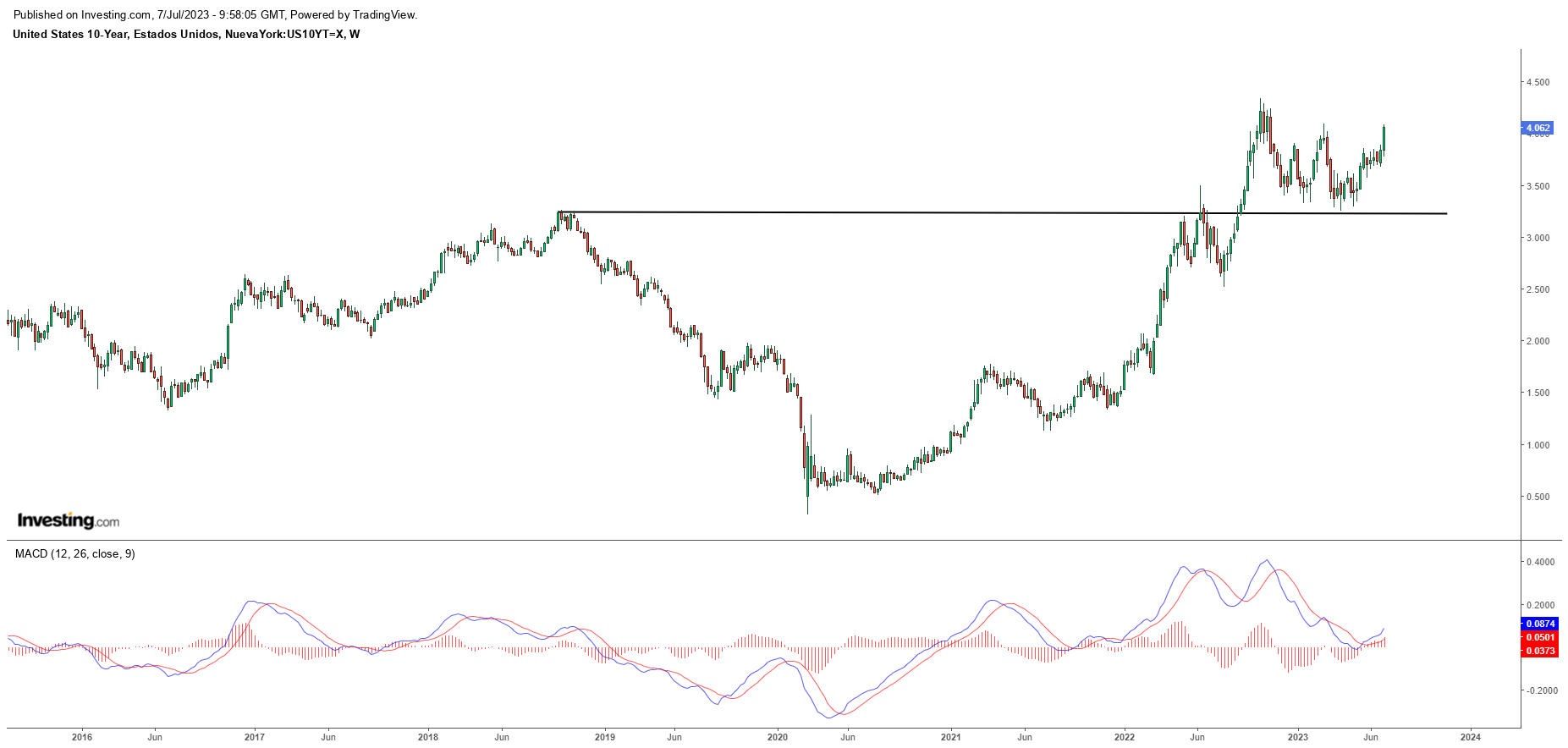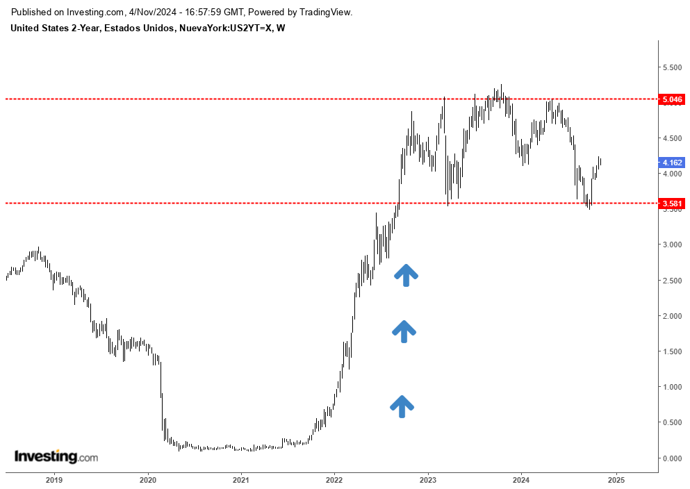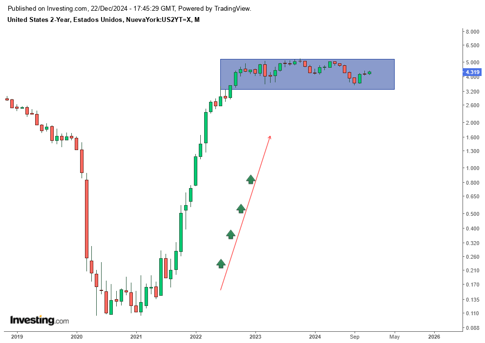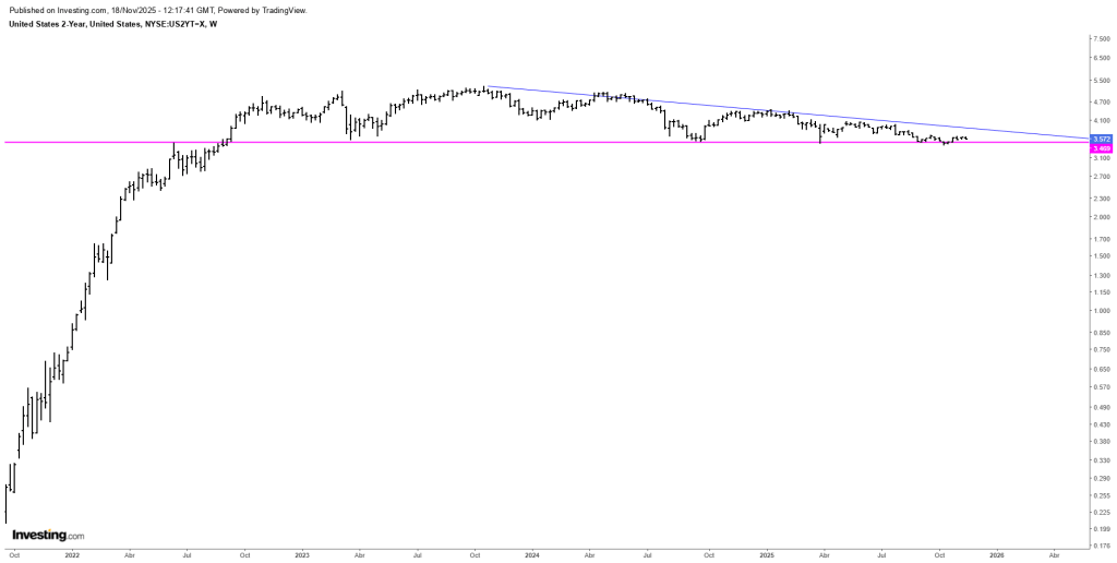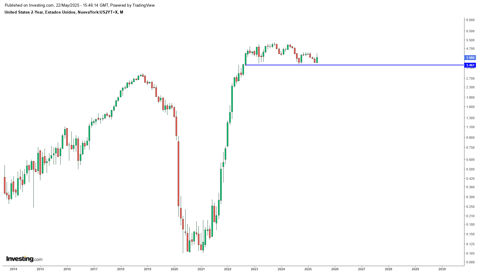 Notas USA a dos años. Clara formación de techo. Mi interpretación es que el mercado espera bajadas de tipos cuando en la FED mande el delegado de Trump.