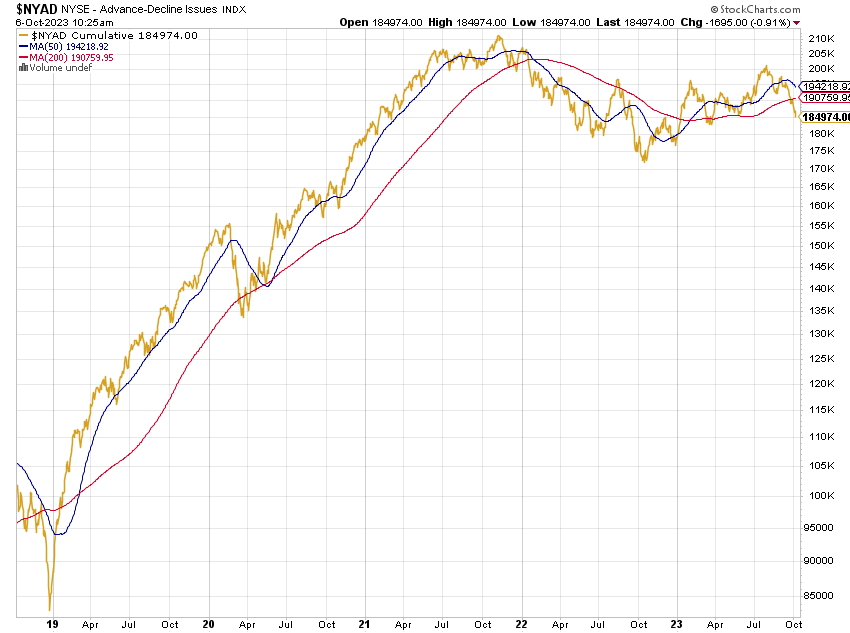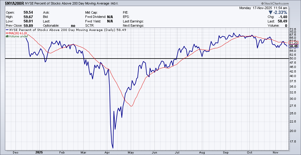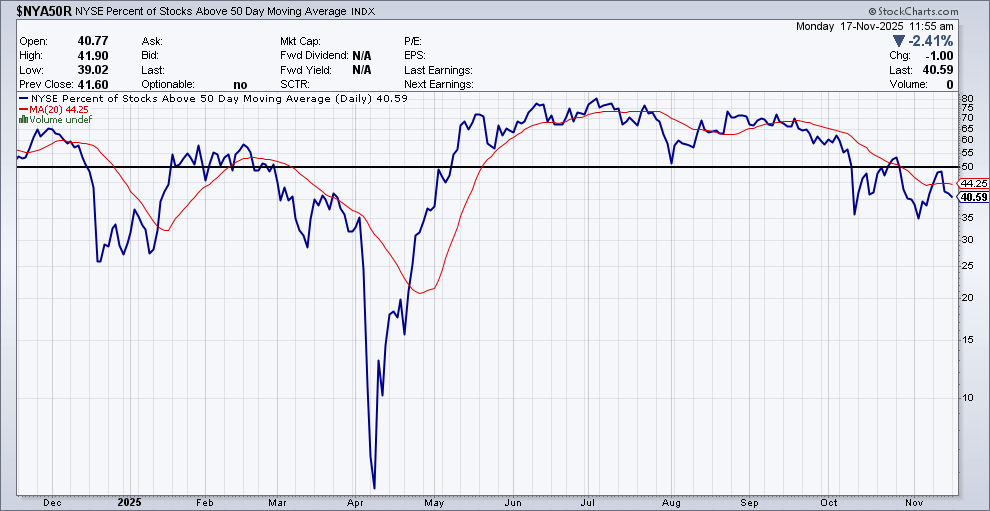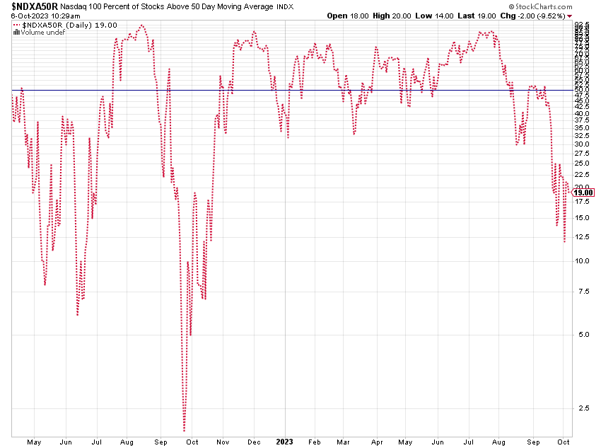 Mismo planteamiento pero con la media de corto plazo, de 50 días. Aquí la situación ya empieza a ser fea. Hay un claro deterioro y más de la mitad de los valores del NYSE han roto por debajo de su primera media móvil importante. Yo no abriría nuevas posiciones hasta que este indicador -mucho más rápido que la media de 200- me diga que el peligro ya ha pasado.