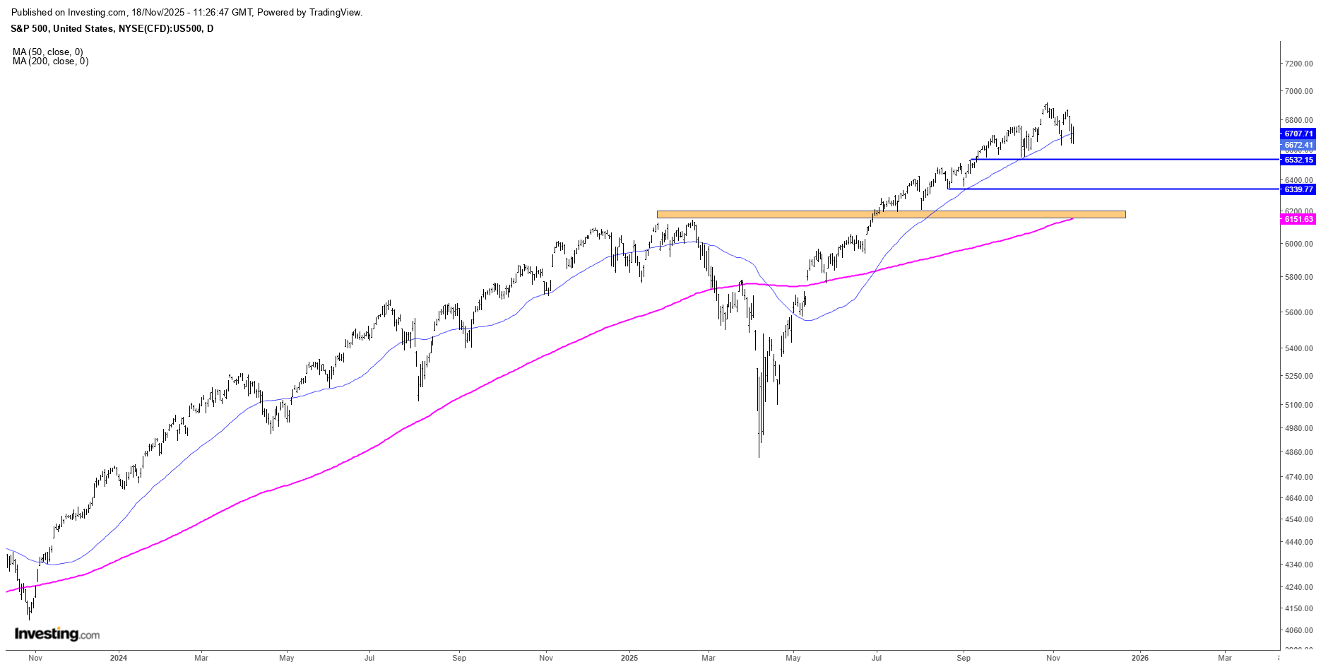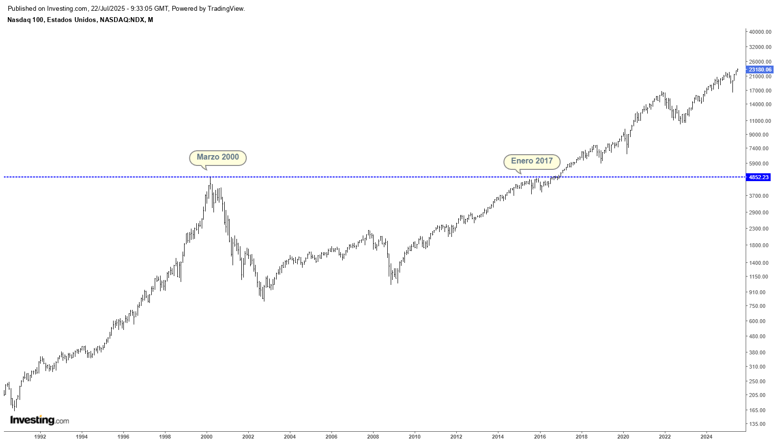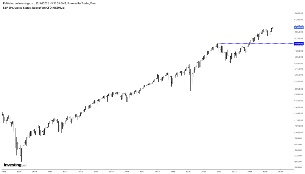 Si hay dos promedios importantes son el de 50 días y el de 200 días (y su equivalente semanal de 10 y 40 semanas). La tendencia hoy sigue siendo alcista. Para empezar a pensar en una corrección seria debería romper el último mínimo más alto en 6.532. Ahí si deberíamos empezar a rascarnos la cabeza y pensar si pasa algo. El nivel clave es el que marca el rectángulo naranja. Ahí coinciden varias referencias técnicas. Ya sería un tercer escalón de bajada (tres mínimos más altos), coincide con la resistencia de máximos que marcó en marzo antes de la corrección de los aranceles y además habría corregido aprox. un 33% del movimiento desde los mínimos. Ni siquiera creo que hoy se pueda hablar de corrección todavía y si de toma de beneficios. Hay que seguir el movimiento, ver adónde nos lleva y controlar los niveles clave.