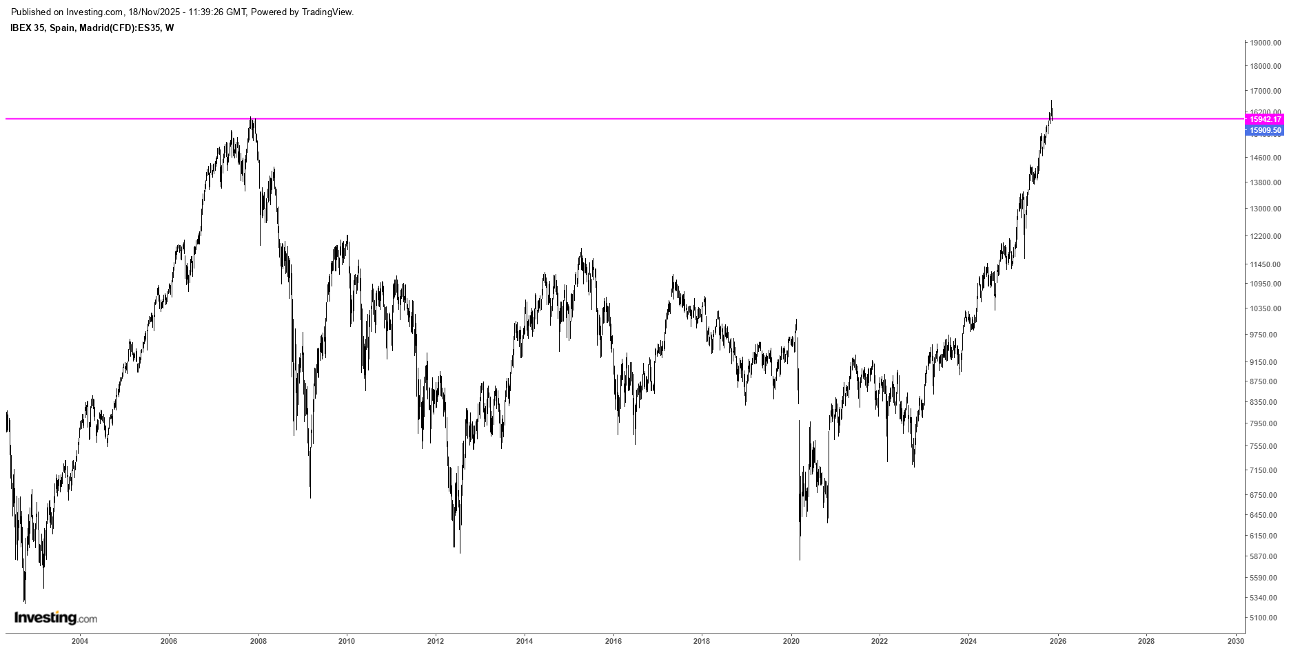El Ibex va como un tiro. Simplemente se está enfrentando a una zona de resistencia histórica: máximos del 2007. Dicho eso asumamos que tenemos un índice de juguete en el que el Top 10 supone el 77.48% de la capitalización total del índice. Imagínese, 10 empresas se acercan al 80% del movimiento de la bolsa española. Además los bancos son amos y señores. Los tres grandes Santander, BBVA y Caixa suman un 35% que si les sumamos Bankinter, Sabadell y Unicaja algún punto más suman. Los bancos han subido lo que no está escrito y el índice con ellos. No tiene mucho más secreto. Si a los tres bancos le suma Iberdrola e Inditex, con estos cinco valores tiene controlado prácticamente el 60% del índice (59.34%). Pero el precio es lo que cuenta y sea por las razones que sea y esté lo concentrado que esté, tenemos a un IBEX que este sí, este si va como un cohete y no la pobre economía real. ¿Algún motivo de preocupación viendo el mensaje del precio? Hoy por hoy ninguno, normal toma de beneficios ante un muro difícil de romper.
