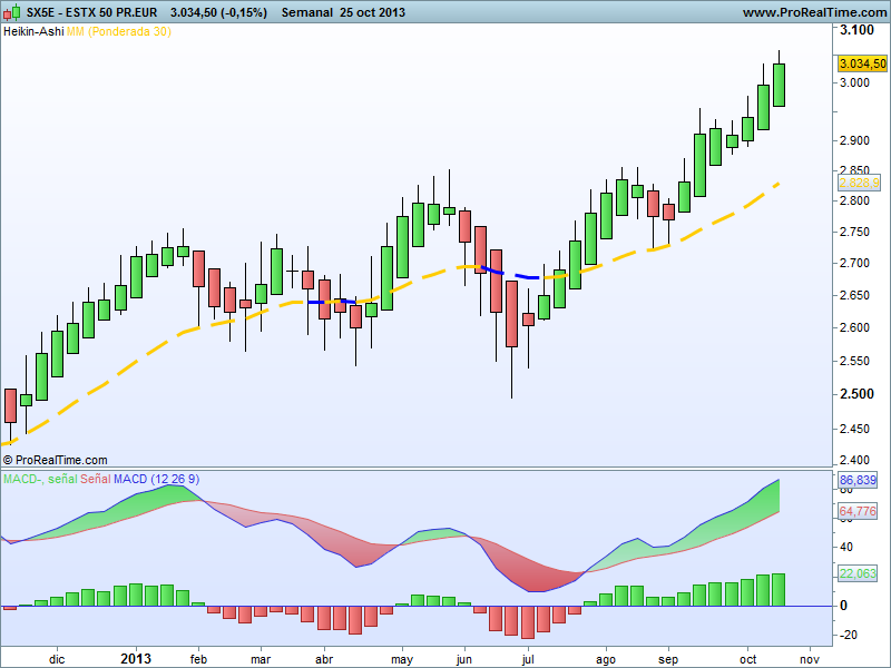 En Estados Unidos, a diferencia de Europa, el mercado no ha dejado de subir y en agosto el S&P ha hecho nuevos máximos. Hoy está en un rango de consolidación tonteando con la directriz alcista pero maticemos lo que maticemos ( he leído varios analistas que coinciden en que “el mercado está cansado”) es un mercado alcista.