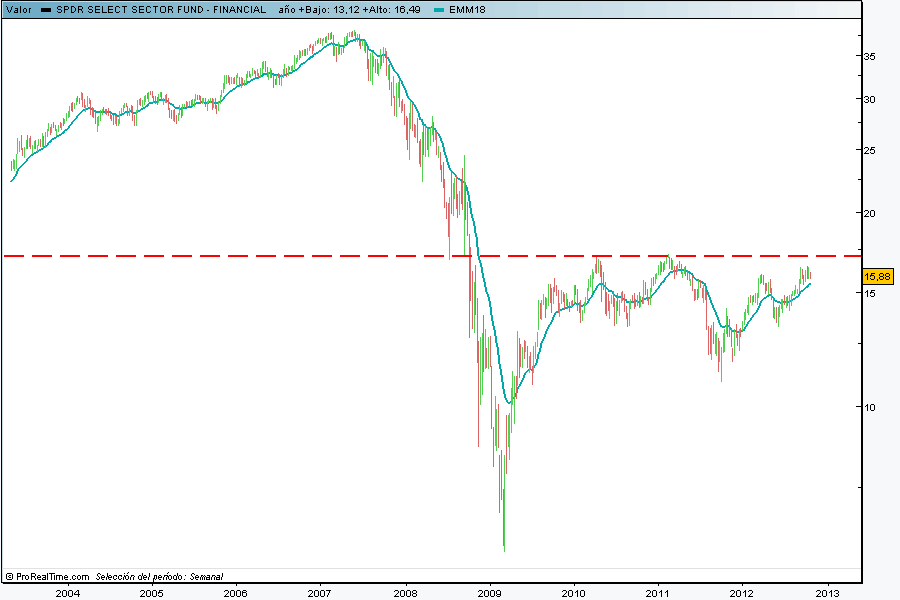 Llegamos a Warren Buffet y su consejo de compra de bancos americanos. Compramos el XLF (ETF de bancos americanos) a 16 dólares y hoy está a 16.47 tras un buen paseo a la baja. De momento no perdemos, ganamos un 3% en menos de dos meses pero el comportamiento del fondo es demasiado volátil. De momento no me entusiasma…aunque si cada dos meses me gana un 3% podré soportarlo.